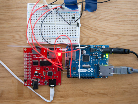 Плата в ответ проигрывает стандартный «гонг» приветствия Macintosh, засекает время и включает внутри eMac мерцающую подсветку. Второй раз датчик срабатывает, когда ушастое существо покидает домик. Подсветка отключается, после чего в Твиттер-аккаунт @eSleeper1 уходит сообщение с временем пребывания кошки внутри домика. Твит сопровождается одним из заранее “забитых” в Arduino текстов: