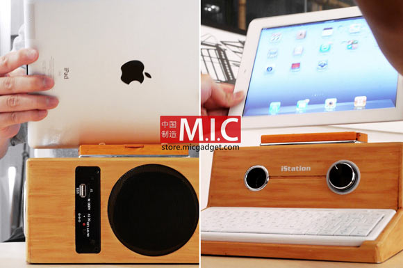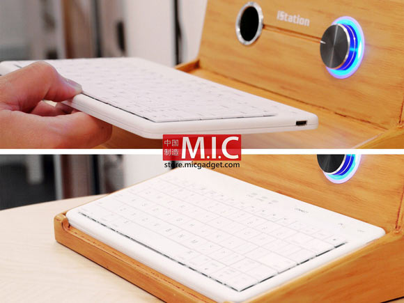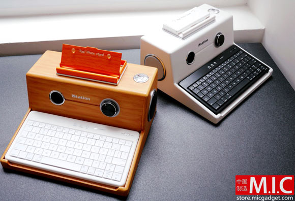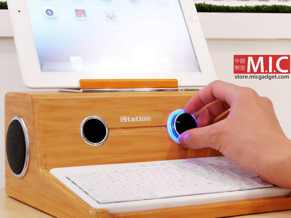 iStation — это массивная док-станция для iPad со съемной Bluetooth-клавиатурой. На верхней части подставки находится 30-пиновый коннектор, куда кроме планшетника можно подсоединить даже iPhone. По бокам расположились два динамика, к сожалению, неизвестной мощности, зато с сабвуфером и рычажком для регулирования громкости на передней части iStation. Музыку здесь можно слушать несколькими способами: через подключенный iPhone/iPad либо через USB-накопители, карты памяти формата microSD или любое другое устройство, подключенное через 3,5 мм стерео-кабель.