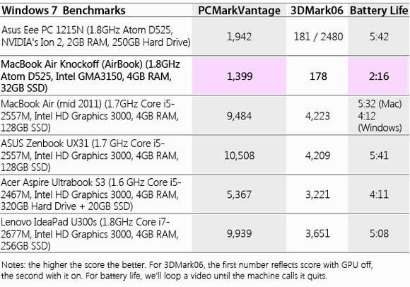 Внутри установлено по-настоящему топовое железо: процессор Intel Atom 1,8 ГГц, 4 гигабайта оперативной памяти и… SSD. Впрочем, обманываться не стоит: из всех возможных вариантов накопителей был выбран наиболее медленный. В результате один настоящий MacBook Air способен думать сразу за четырёх AirBook, а в некоторых задачах обгоняет его вплоть до восьми раз.