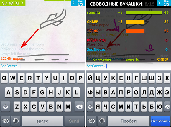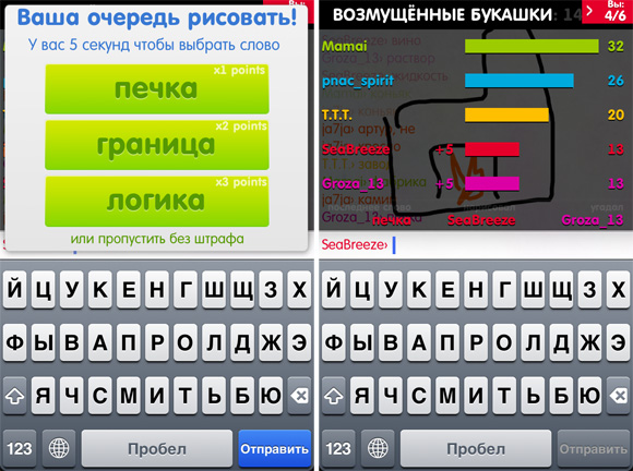 Угадывание происходит так. Пока вы что-то рисуете, другие игроки печатают свои догадки. Как только кто-то угадывает, раунд заканчивается, победитель получает свои очки. Вы тоже не остаетесь в накладе, если смогли внятно донести до всех свою мысль.