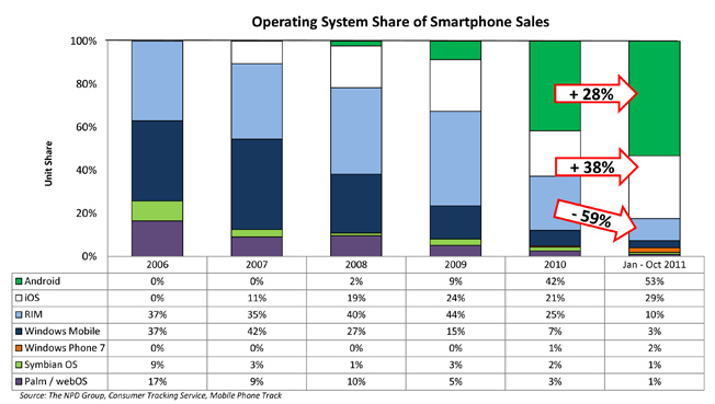 В течение нынешнего года Android последовательно терял свою привлекательность в глазах разработчиков. Если в первом квартале предпочтение «роботу» отдавали 37% респондентов, то к третьему кварталу их количество снизилось до 25%. За последние месяцы ситуация совсем немного улучшилась для Android — всего на два процента. За 2011 год многие девелоперы разочаровались в возможностях заработка от проектов для мобильной ОС Google. Среднестатический разработчик приложения для Android зарабатывает на своём творении в четыре раза меньше, чем девелопер программы для iOS.