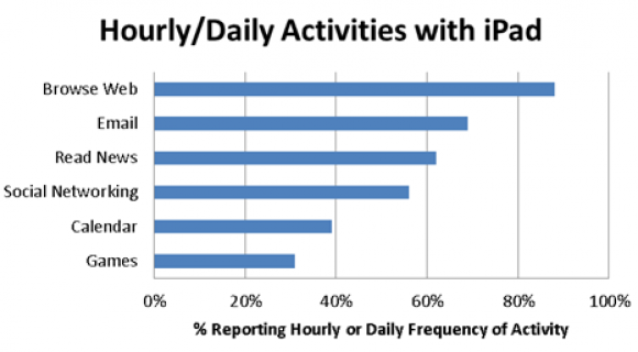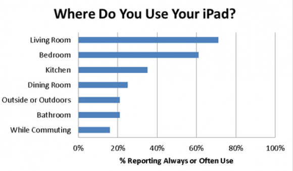 Опрос также показал, что наиболее удобным местом для работы с iPad является гостиная, на втором месте спальня, затем кухня и столовая. Чаще всего планшет используется для веб-серфинга. Далее по уменьшению идут просмотр электронной почты, чтение новостей и погружение в социальные сети.