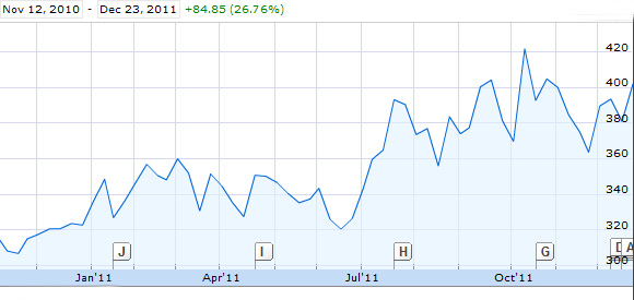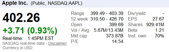 Курс AAPL на google-finance по стостоянию на 23.12.2011. Торги не закрыты
