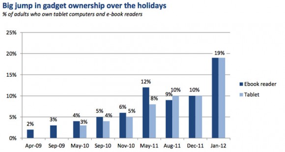 The Pew Research Center в понедельник опубликовал данные собственного исследования пользовательского рынка планшетов. Согласно их данных с “дорождественского” момента, до сегодняшнего дня количество владельцев планшетов и электронных книг в США увеличилось на 9%. Это подтверждает сообщения некоторых СМИ о том, что планшеты и читалки были самыми востребованными подарками к Рождеству и Новому Году.