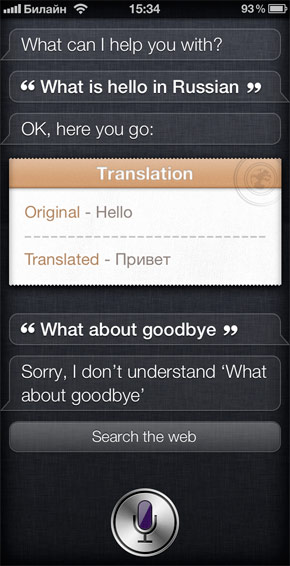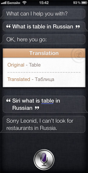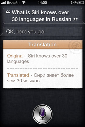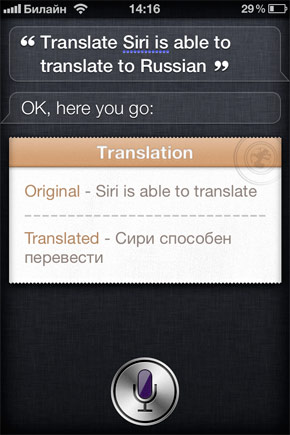 Добрым словом хочется отметить бежевый «листочек», на котором выводится произнесённая фраза и перевод. Его дизайн вполне соответствует стандартным информационным полям Siri, будь то прогноз погоды, данные из WolframAlpha или текстовые сообщения.