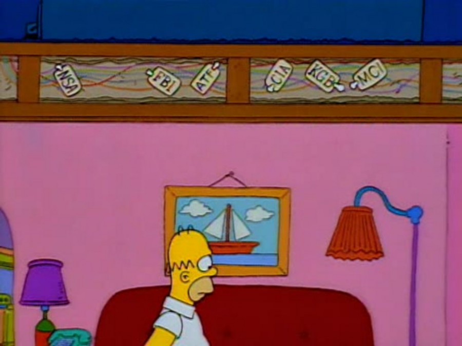 В полнометражном мультике показывалось, как Симпсоны скрывались от правительства после побега из купола, тогда затронула тема глобальной слежки со стороны властей США.