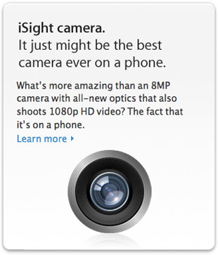 Но не общением единым. Есть же камеры, предназначенные в первую очередь для съёмки. Их нет в компьютерах, но они есть в портативных девайсах. И Apple решила назвать их старым именем! Впервые за долгое время слово «iSight» прозвучало позавчера, на презентации нового iPad. Мы-то думали, что продукты предыдущих лет трогать не будут — ан нет, спецификации смартфонов на сайте Apple теперь тоже пестрят этим словом. В iPad и iPhone 4 установлены 5-мегапиксельные модули, в 4S — 8-мегапиксельный. [macrumors]