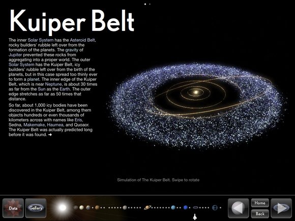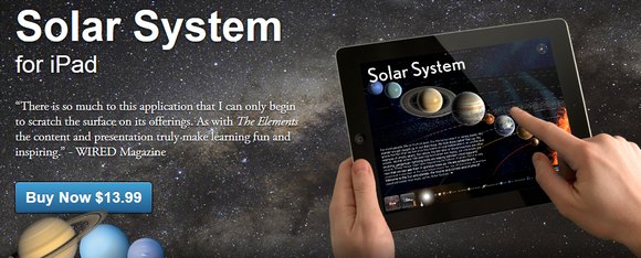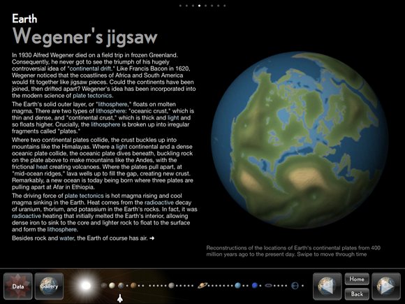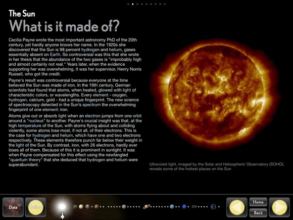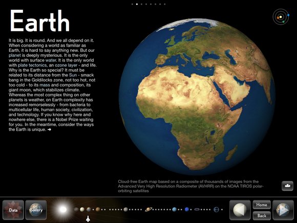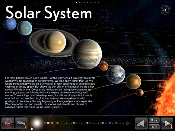 Каждый второй мальчишка хотел стать космонавтом, однако жизнь и здоровье распорядились иначе. Стремление к звёздам с годами не проходит. Solar System эксплуатирует наш интерес к устройству Вселенной, сужая его до границ Солнечной Системы. Естественно, каждой планете уделено повышенное внимание, не ограничивающееся простым перечислением размеров и массы небесного тела. Истории открытия, легенды и домыслы, видеоролики из архивов NASA, интерактивные схемы и графики, даже полноценные симуляции в полном 3D и 3D-объекты — большой рывок вперёд с точки зрения современных технологий и в сравнении с более свежими приложениями от того же издателя.