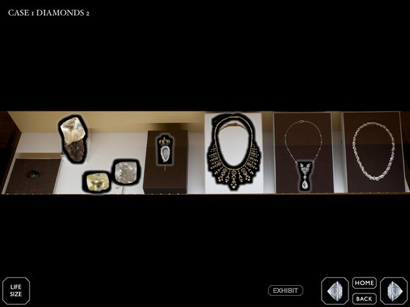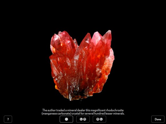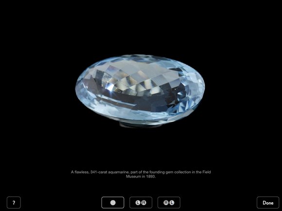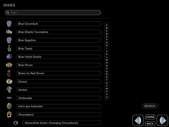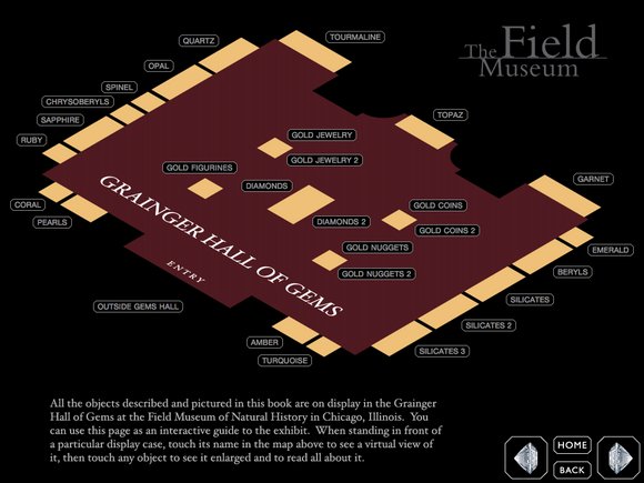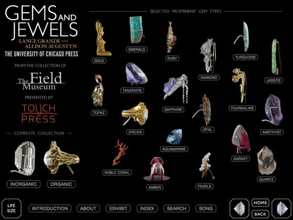 Все страницы книги проиндексированы и доступны в алфавитном порядке в соответствующем меню. Там же есть строка поиска. Для разнообразия контента, в приложение был добавлен режим «выставки». Издание было подготовлено с использованием экспонатов чикагского Музея естественной истории имени Филда, и по одному из его залов можно «побродить» в Gems and Jewels. Впрочем, особого смысла в этом нет. По нажатию на карту зала открываются полки с экспонатами, на которые буквально налеплены 3D-фотографии из приложения. Когда вы ознакомитесь со всеми страницами, доступными из оглавления, кликните на Introduction и убедитесь, что вы ещё не видели и трети информации из этой книги. Видимо, всё не поместилось на титульник.