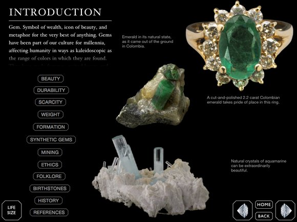 Самое свежее и наиболее масштабное издание от Touch Press из этой тройки интерактивных книг. Как следует из названия, приложение целиком и полностью посвящено ювелирной индустрии. Gems and Jewels покрывает практически все этапы создания ювелирных изделий, начиная от разработки месторождений и заканчивая особенностями разных методов огранки драгоценных камней. Исторические справки, физические и даже химические параметры каждого драгоценного металла или камня перемежаются с высокодетализированными фотографиями и объектами в псевдо-3D.
