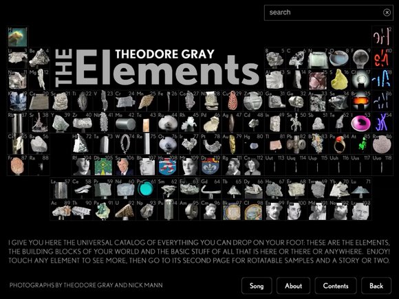 Титульная страница книги является оглавлением и одновременно (вот неожиданность) — таблицей Менделеева. Расположение элементов в ней может отличаться от некоторых школьных плакатов. Создатели книги привели оглавление в соответствии с «длинным» вариантом изображения периодической системы элементов. В отличие от Gems and Jewels, оглавление сосредотачивает абсолютно весь контент в приложении. Другое дело, что вместо 15 пунктов здесь отображены сразу 100 с лишним. Все они анимированы и двигаются одновременно, так что при первом запуске не получится уверенно выбрать что-нибудь. Обязательно начинайте изучение материалов приложения с первого элемента — повествование в текстовой части взаимосвязано и последовательно.