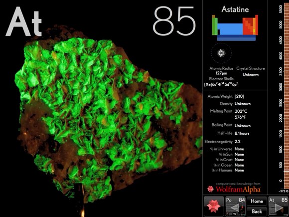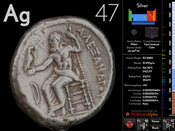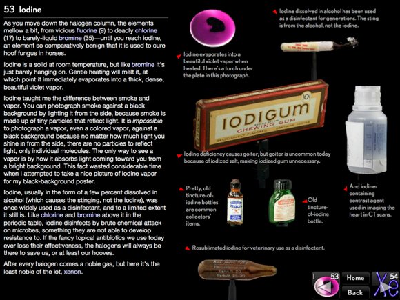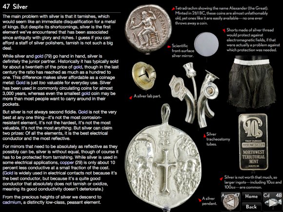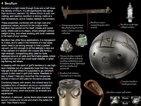 Следующая страница понравится людям с филологическим складом ума. Левая часть экрана отведена для текстового описания элемента. Здесь сосредоточена самая интересная информация от автора — Теодора Грея, известного коллекционера драгоценностей и химических элементов, колумниста легендарного журнала Popular Science и со-основателя компании Wolfram Research. Человек, посвятивший свою жизнь поиску и изучению элементов таблицы Менделеева, знает о качествах и истории каждого из них намного больше, чем совокупные данные всех соответствующих разделов Википедии. При этом текст изобилует юмором (местами — немного специфическим) и многочисленными историями из реальной жизни, включая и жизнь самого Теодора. Если вкратце — это интересно.
