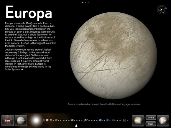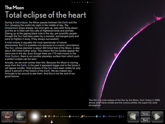 Вместо пяти с лишним различных изображений, большую часть экрана занимает текст. Его автор, Маркус Чоун, является журналистом-космологом и, судя по профессии, должен был бы легко написать интересные материалы для приложения. Однако интересность этих текстов оставляет желать лучшего в сравнении с тем, что предлагают The Elements и Gems & Jewels. Несмотря на соблюдение принципа «просто и понятно», информации в приложении не хватает уникальности и, не побоюсь этого сказать, души. Если два предыдущих приложения я прочитал и просмотрел чуть ли не с упоением, Solar System впечатлила гораздо меньше. И тематика тут не при чём.