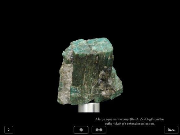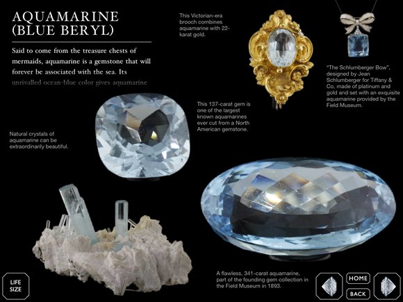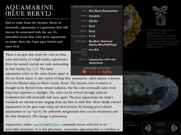 Титульный экран является оглавлением книги и одновременно классификацией драгоценностей по используемым природным материалам. Каждая мини-глава отмечена характерной 3D-фотографей. Рассмотрим пример на известном камне — аквамарине. Он является лишь разновидностью берилловых минералов, в число которых входят изумруды и морганиты. Цвет — лишь небольшая деталь, которая ценится человеком, а для природы практически ничего не значит. Обычный берилл прозрачен и обладает меньшей ценностью, чем его цветные варианты.