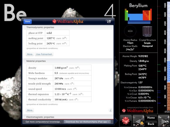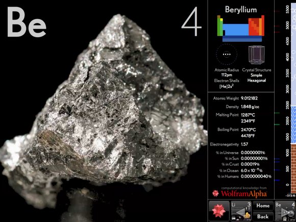 В качестве примера рассмотрим четвёртый элемент таблицы Менделеева в представлении The Elements. Это берилий — специфичный лёгкий металл, используемый исключительно в ракетно-космической отрасли и в рентгеновском оборудовании. У каждого элемента есть своя титульная страница, забитая научной информацией. Большая 3D-фотография предмета, в составе которого есть рассматриваемый элемент, занимает 70% экрана. Рядом с ней расчерчена таблица данных: атомная и кристаллическая структура элемента, количество электронов, атомный вес, плотность, температура кипения и плавления, электронегативность и процентное содержание элемента в человеке, океанах Земли и даже Вселенной. Вдруг понадобится. И если всего этого вам будет мало — можно запросить данные из Wolfram Alpha.