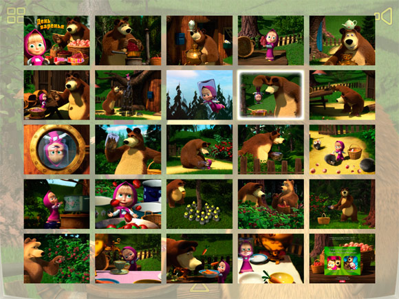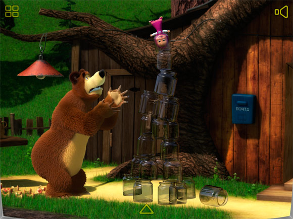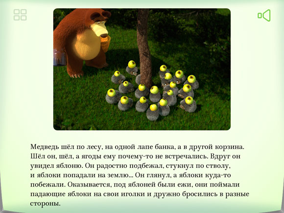 Впрочем, самое интересное-то как раз происходит на самом слайде. Юный пользователь может взаимодействовать с персонажами и объектами — перемещать их, вертеть, а также включать анимацию и звуки. Нажали на Машу — она что-нибудь сказала (или, на медвежье горе, сделала). Ухватились за трубу — та согнулась. Стукнули по самовару — он зазвенел. С большинством примечательных объектов на экране можно что-нибудь сделать перед тем, как перелистнуть страницу. Чтобы переключиться с речи диктора на фоновые мелодии и озвучку ваших действий, нажмите кнопку в правом верхнем углу.