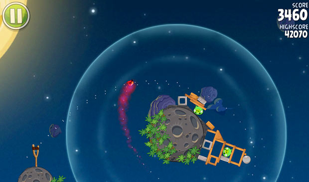 Как следует из названия игры Angry Birds Space, противостояние пернатых и парнокопытных разворачивается в космосе. Свиньи либо сидят на планетах, либо висят в скафандрах, окруженные защитными сооружениями. Чтобы птичкам добраться до врага, надо преодолевать гравитационные поля астрономических тел. Если раньше полет птицы укладывался в классическую параболу, то сейчас траектория выписывает такие кружева…