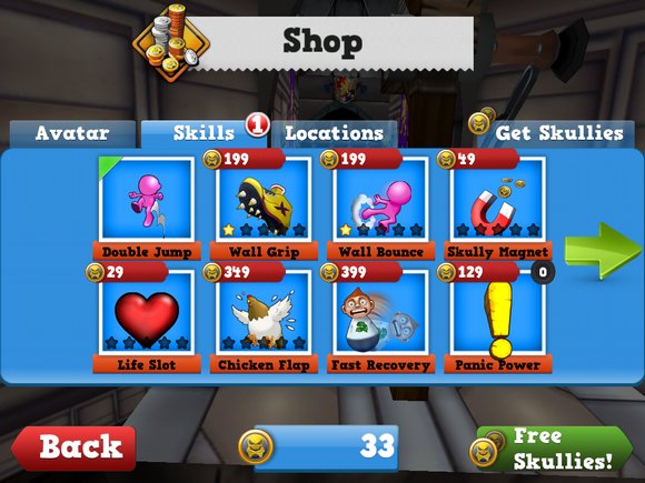 Монетки применяются по назначению по завершению прохождения уровня. Помимо изменения внешнего вида главного героя, игра предлагает нам несколько полезных навыков на выбор и улучшение уже существующих. Почти всё действительно полезное можно купить на честно заработанные «черепки». Для ускорения процесса заработка виртуальных денег предусмотрен режим особо сложных, но коротких испытаний и бесконечный бег на выживание с автоматически генерируемым коридором.