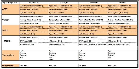 Canaccord Genuity месяц за месяцем проводит мониторинг четырех ведущих мобильных операторов США, собирая подробные показатели продаж. По их данным в лидерах, кроме iPhone 4S, прочно укрепились Galaxy S II, Galaxy Nexus и Motorola Razr.