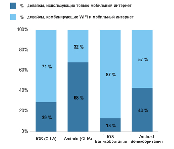 В Великобритании цифры несколько разнятся, но и тут WiFi наиболее распространен у юзеров яблочных девайсов. 87% против 57% на Android.