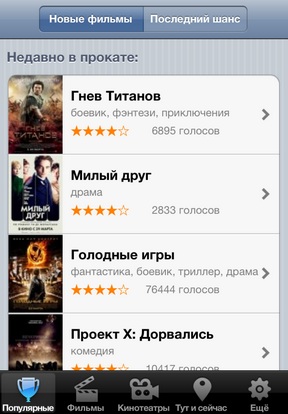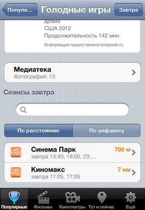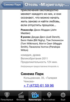 На главном экране отображаются самые популярные фильмы из тех, что сейчас показываются в прокате по России. Нажав на любой из них, мы перейдём на экран описания картины. Помимо традиционной сюжетной завлекалочки, в тексте отдельным блоком упомянуты режиссёр и актёры фильма, а так же жанр, год выпуска и страна производства. Данные честно собираются с общеизвестного портала Kinopoisk.ru. Оттуда же берётся рейтинг картины по голосам посетителей сайта. За описанием следует раздел промо-фотографий из фильма. К сожалению, трейлеров в этом списке пока нет.