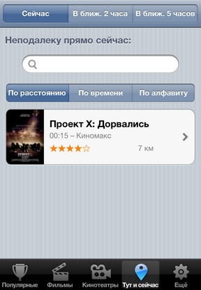 Теперь, когда мы разобрали основной функционал ёBudka, обратим внимание на три оставшиеся вкладки программы. Во вкладке «Фильмы» показаны все кинокартины в российском прокате за текущий месяц. Поиск фильма для просмотра можно начать и со вкладки «Кинотеатры», где вместе с адресом заведения отображено всё, что можно посмотреть в указанном месте до конца дня. Наконец, «Тут и сейчас» покажет все фильмы в ближайших к вам кинотеатрах, на которые вы ещё можете успеть явиться.