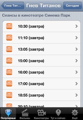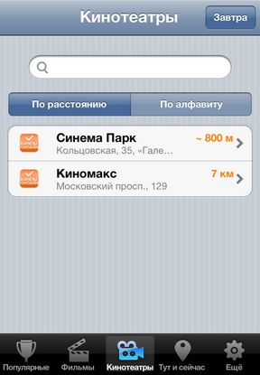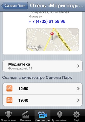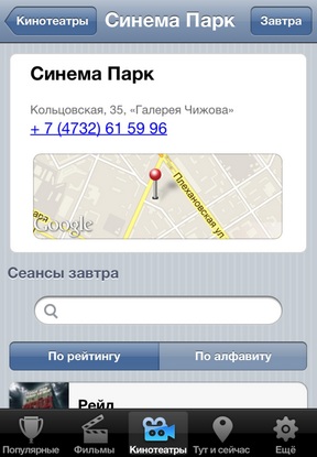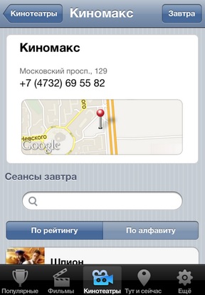 Предположим, что описание и жанр кино подошли под наше настроение. Теперь в дело включаются локационные сервисы. Ещё при первом запуске приложение попросит выдать местоположение нашего устройства. На основании полученных данных, ёBudka отобразит все кинотеатры недалеко от нас, что показывают нужный нам фильм. Для тех, кто «не местный», программа выдаст адрес и телефон выбранного кинотеатра вместе с положением на карте Google Maps. Теперь мы знаем, что именно будем смотреть и где. Остаётся последний вопрос — когда.