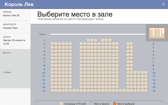 Чуть ниже на той же странице выводятся все сеансы понравившегося фильма на сегодняшний день. Если вы захотите купить билет заранее, нажмите на нужный сеанс — и вы попадёте в интерфейс внешнего платёжного сервиса Rambler-Касса.