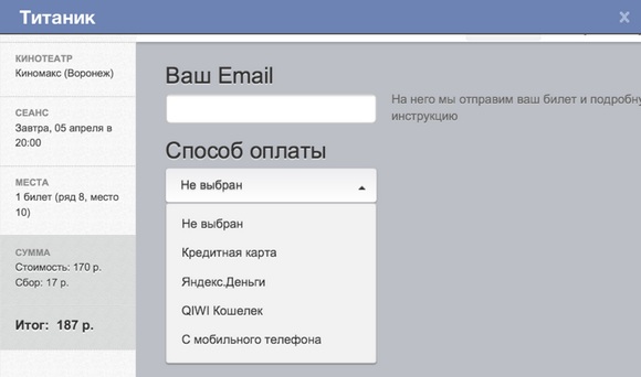 Тут всё проще некуда. Выбираем нужные места двойным нажатием, подтверждаем заказ и вводим почту, на которую отправляется электронный билет. Далее выбираем метод оплаты. В зависимости от кинотеатра, его может и не быть (придёт лишь номер брони), или же выпадет список, аналогичный тому, что изображён выше. Данные банковской карты вводятся прямо в приложении; Яндекс перенаправляет запрос на свой сайт; Qiwi просит номер кошелька; наконец, можно оплатить билет «смской». Средняя сумма сбора, который забирают себе создатели приложения, составляет около 10%.