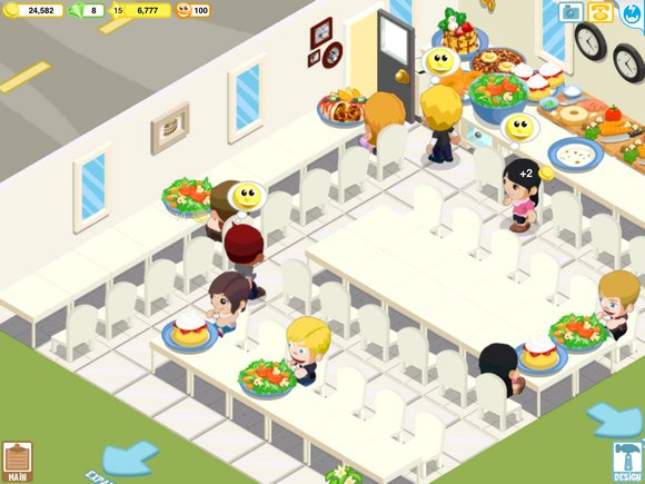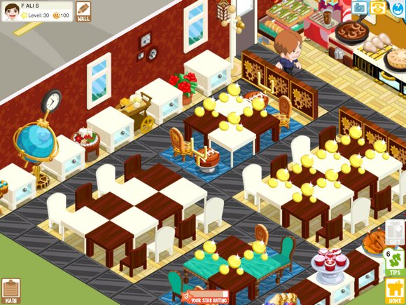 Как только посетитель завершил картинно уплетать еду, он оставляет положительный отзыв и мизерную сумму игровых монет. Чем больше положительных отзывов у нас — тем больше людей придут в следующий раз. А деньги тратятся на постоянные редизайны помещения и увеличение его размеров. Естественно, никто не запрещает «слизать» идею у других. Для этого предусмотрена случайная выборка других игроков, к которым мы можем зайти и оставить чаевые. Добавив любого в список своих «соседей», мы сможем получать от них полезные игровые подарки каждый день.