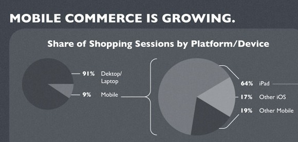Из всех совершаемых онлайн сделок 91% происходит с помощью ПК и 9% с помощью мобильных девайсов. Из этой доли 64% занимают покупки совершенные с iPad. Еще 17% – другие iOS устройства и лишь 19% – другие платформы.