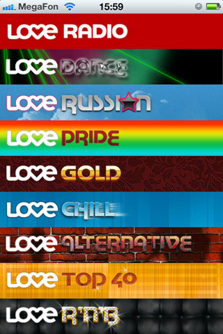 Открывая приложение, пользователь попадает на главную панель управления. Нажав кнопку «play» тут же можно услышать прямой эфир Love Radio, а также увидеть название воспроизводимого трека и последующего. Найти музыку себе по вкусу возможно нажав на кнопку «Найди Свою Любовь». Тут есть выбор из восьми онлайн станций: Love Gold, Love Russian, Love Alternative, Love Dance, Love Chill, Love Top40, Love Pride и Love R’N’B.