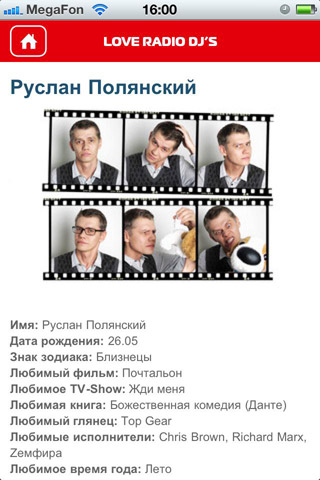 Также на главной странице приложения размещено имя и фото диджея, который сейчас в эфире. Кликнув на него, пользователь переходит к личному профайлу звезды эфира Love Radio.
