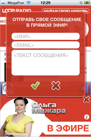 10 марта 2012 года мы выпустили новое обновление, которое позволяет по умолчанию сохранить настройки качества звука (28 kbps или 64 kbps) и имеет прямую ссылку на Твиттер Love Radio (Twitter.com/LoveRadioRu). Кроме этого, можно выбрать дополнительные платные функции, которые позволяют отключить ротацию рекламных баннеров и, самое главное, отправлять сообщения в прямой эфир, в программы LOVE MESSAGE и BIG LOVE MESSAGE!