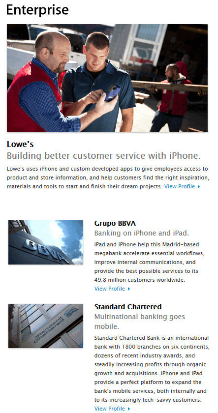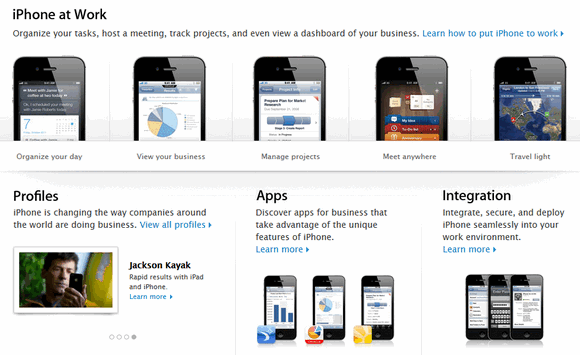 В качестве иллюстраций самых разных возможностей смартфона, что могут помочь в выполнении рабочих задач, используются не только встроенные приложения и настройки системы, но и некоторые программы из App Store. Описания максимально просты и понятны — в лучших традициях Apple. Среди упомянутых фич: поддержка Microsoft Exchange, VPN и корпоративных установок Wi-Fi. Упоминается и безопасность платформы iOS. На странице «Профили» размещены своеобразные «истории успеха» внедрения iPhone в бизнес-структуры с заявлениями конкретных компаний.