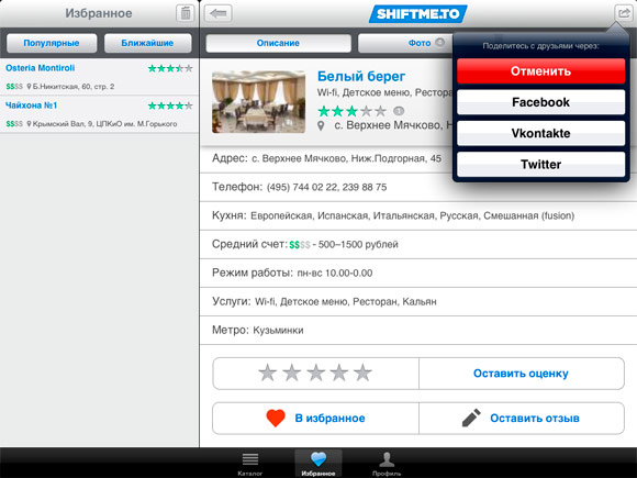 - Описание. Пара слов от администрации, адрес, телефон, те самые кухня-счёт-услуги-метро, а также — клавиши для добавления в избранное, для проставления оценки и для написания отзыва. Последние две имеет смысл объединить. Пусть желающий ставит оценку и по желанию добавляет отзыв, как это принято в большинстве сервисов.