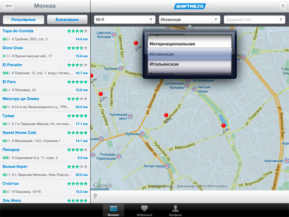 Со всех сторон логичное действие: выбрать, скажем, станцию метро слева, а затем — с помощью выпадающего списка — сузить круг поиска до тех ресторанов, где есть Wi-Fi. Но нет, когда вы выбираете что-то из списка, новый перечень заведений формируется с нуля. Я только что выбрал Театральную, ткнул в «Wi-Fi» — а мне уже предлагают Новогиреево! Оказывается, списки взаимодействуют только между собой. Иными словами, если в первом вы выбрали живую музыку, во втором — европейскую кухню, и в третьем — средний счёт от 500 до 1500 рублей, то на карте и впрямь отобразятся только интересующие вас рестораны. Однако тут возникает вопрос: к чему предлагать выбор из бокового меню? Пусть там формируется уже только перечень ресторанов. А для метро — для метро нужно сделать такой же выпадающий список.