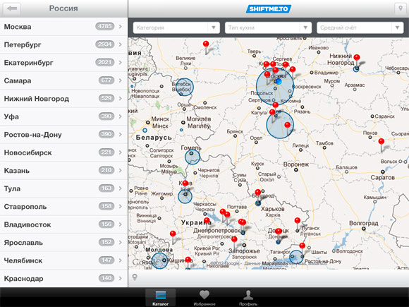 Три из четырёх перечисленных признаков (тип заведения, кухня и средний счёт) дублированы над картой — там действуют выпадающие списки: