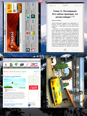 На этих двух скриншотах показан менеджер многозадачности CardSwitcher в режиме Grid. Четыре приложения на страницу, кнопки для закрытия, красные «наклейки», как на иконках — всё очень удобно. Вот только работать в приложениях прямо с этого экрана нельзя — прежде нужно зайти в одно из них, чтобы оно развернулось на весь экран. А вот если бы было можно — то получился бы самый настоящий многооконный интерфейс. Представьте: в одном окне вы запускаете злую птицу, а в другом — пока она летит — просматриваете ленту Твиттера. Интересно?