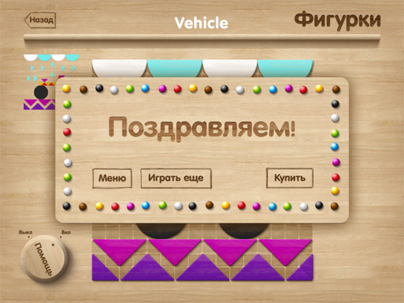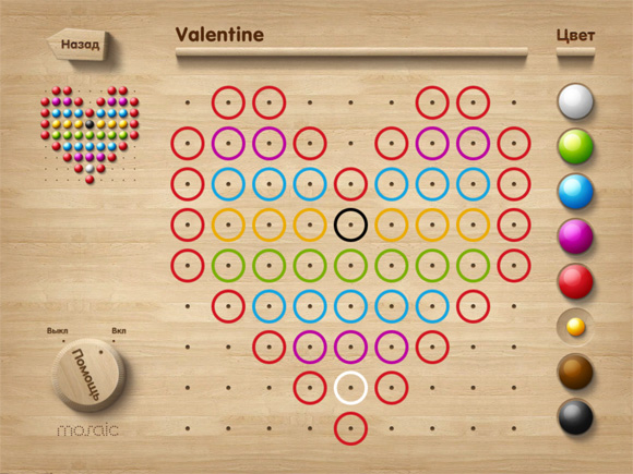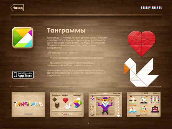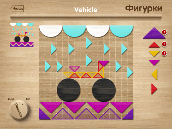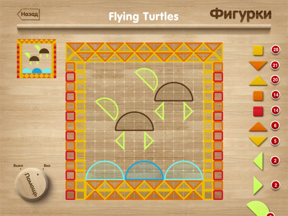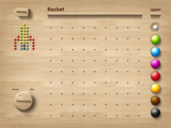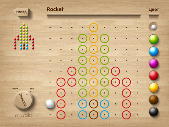 О Мозаике HD в прошлом году рассказывал Никита Горяинов, и я с ним смело соглашусь — достойных аналогов в App Store нет. Классическая мозаика, выполненная в фирменном «деревянном стиле» затягивает не только детей, но и взрослых. С удовольствием вспомнил, как в детстве выкладывал советскую пластиковую мозаику на игровом поле с дырочками. В демо-версии, как и в Tangram Puzzles, есть несколько разных вариантов мозаики, которые меняются с каждой новой игрой.