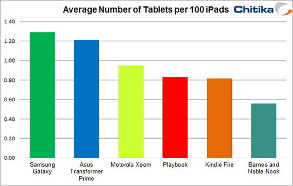 Кроме того, сейчас в США Kindle Fire занимает более 50% рынка Android-планшетов, но в исследованиях Chitika Insights на сей аппарат приходятся лишь смешные 0,8% веб-траффика. «Чемпионом» же, занимающим второе после iPad место, является линейка Samsung Galaxy Tab с 1,22%. На третьем месте ASUS Transformer Prime с 1,2%. Старейшему планшету на базе Android, Motorola Xoom, досталось чуть меньше 1% веб-траффика.