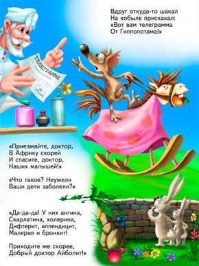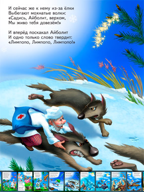Приложение Айболит по всем известной сказке Корнея Чуковского имеет, на первый взгляд, стандартную структуру: страницы-слайды с текстовыми блоками. Вот только в понятие стандарта мы также вкладываем возможность отключить текст и насладиться голосовым повествованием (см. книгу Теремок и ассортимент Детской библиотеки). Тут же вы делаете первое неприятное открытие: озвучки голосом здесь нет (!!), как нет и фоновых мелодий. Без голоса единственным способом изложения действительно остаётся текст, и в том, чтобы лишить юного пользователя возможности его отключить, даже начинает прослеживаться какая-то логика.