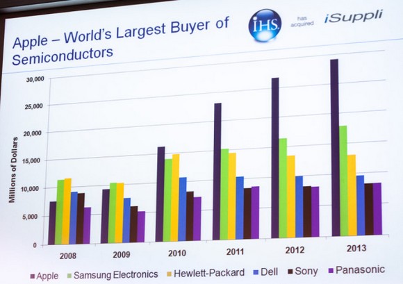 Аналитическая компания iSuppli публикует результаты очередного расчета мировых закупок комплектующих в 2013 году, согласно которым, Apple вновь станет крупнейшим мировым потребителем электронных чипов. В 2011 году компания потратила 23 миллиарда долларов на такое «железо» — на 50% больше, чем ее ближайшие конкуренты на рынке. В текущем году эта сумма должна достичь 27 миллиардов, а в следующем — 29 миллиардов долларов.
