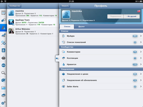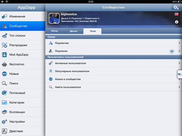 Но пока сайт вторичен. Важнее, что сервис работает хорошо, а iOS-клиент стабилен и достаточно быстр. В AppZapp тяжеловато разобраться нахрапом, но стоит приложить немного усилий, и программа легко заменит любого конкурента, и я еще не вспоминаю о социально-сетевых возможностях сервиса, которые на данный момент в этой области уникальны.