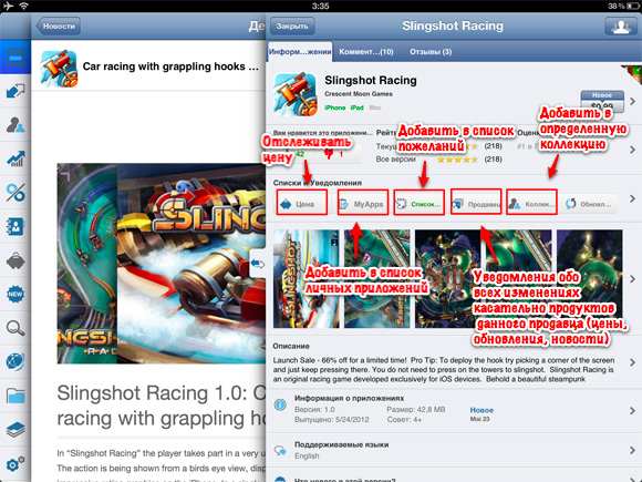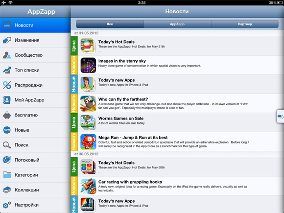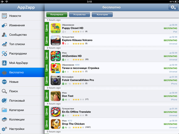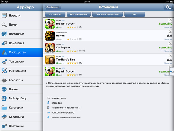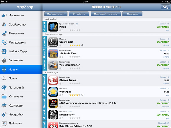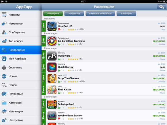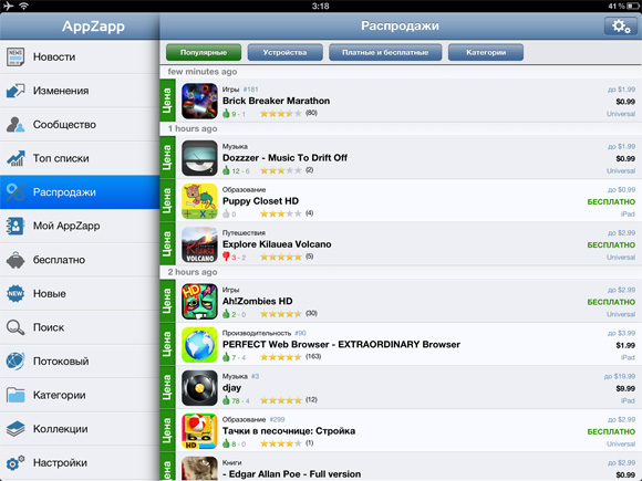 Версия программы для iPad бесплатна и полноценна, поддерживает Push-уведомления, в отличие от бесплатной версии для iPhone, в которой уведомлений нет. А вот за $1 такие появятся и на телефоне. Кстати, в начале своего пути планшетная версия AppZapp тоже была платной.