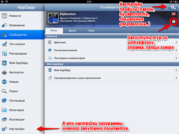 О социальной составляющей AppZapp могу отозваться лишь положительно. Хорошо, что она есть, при этом совершенно не навязчива. Хочешь — пользуешься социальной сетью, не хочешь, не пользуешься. Никаких ограничений нет, а вот плюсы очевидны и о них я писал выше. Из минусов в этом разделе нашел лишь один и то, это, похоже, глюк программы. Она не понимает русскоязычного ника и выводит вместо него вопросительные знаки.