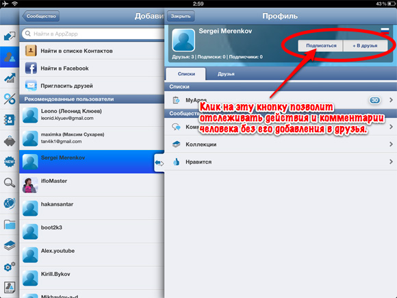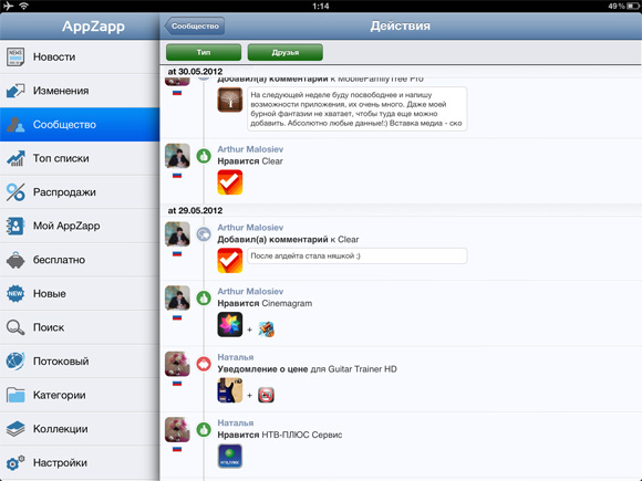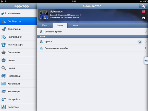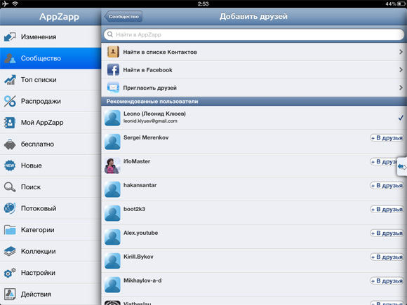 Все взаимодействия с друзьями происходят на одноименной вкладке в меню «Сообщество». Именно здесь можно ответить на предложения о дружбе или же разослать собственные, поискать известных вам зарегистрированных в AppZapp пользователей или же пригласить новых из личного списка контактов в Facebook и в адресной книге. Приглашения рассылаются через Facebook, электронную почту и даже SMS-сообщения. Тут же можно пошариться по спискам приложений и другим закоулкам учетных записей друзей, о чем я рассказывал ранее.