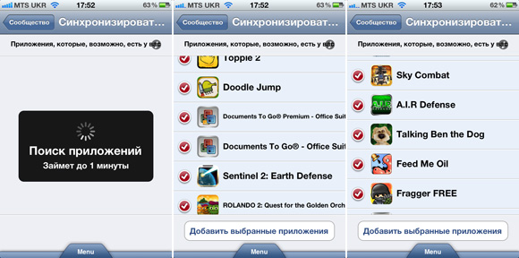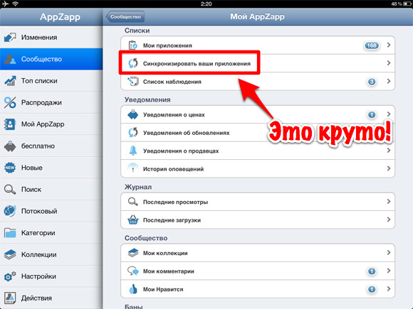 Обратите внимание на опцию «Синхронизировать ваши приложения» (вновь дублируется с основным социальным меню), она уникальна для мониторинговых программ и позволяет быстро добавить в личную базу данных AppZapp предположительно установленные в текущий момент на iГаджет приложения, что сильно облегчает процесс переезда в этот сервис с App Shopper, к примеру. Правда, не совсем понял по какому принципу и где сервис находит продукты, так как там попадались программы, отсутствующие в моей учетной записи и при этом не находились некоторые установленные приложения. Но, как бы там ни было, более полутора сотен моих программ AppZapp нашел.