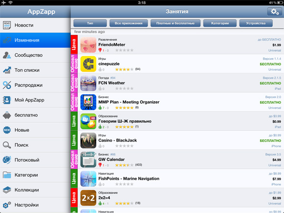 Вторая важная часть AppZapp — это, собственно, мониторинг App Store на предмет скидок, распродаж, обновлений приложений и появления новых. В программе есть несколько разных вариантов просмотра изменений в магазине приложений и что они собой представляют, легко понять по названиям и скриншотам ниже: