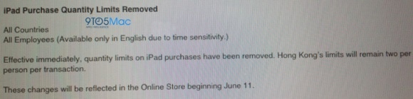 С чего бы компания решила проблему с дефицитом на iPad 3-го поколения именно сейчас? Все просто. Планшет, конечно, легкодоступен и есть практически в любом фирменном магазине и не только, но до последнего момента по всему миру было ограничение в фирменной рознице — не более двух iPad в одни руки. Теперь, судя по данным источника, это ограничение спешным образом снимается. Компания разослала тематическое постановление по внутренним каналам: